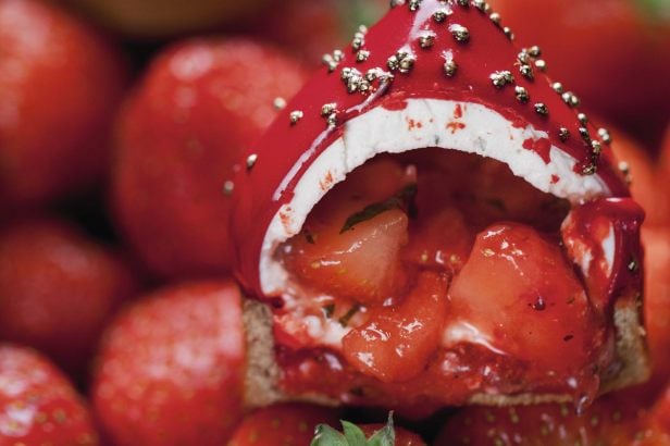 Une délicieuse tartelette à la fraise composée d'une ganache au basilic, d'une gelée et d'une compotée de fraises, ainsi que d'une crème d'amande-fraise.