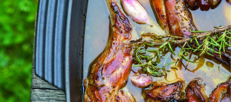 Thierry et France mêlent les légumes de leur immense potager aux agneaux de leur élevage. Une étape fait la différence : le passage des morceaux de viande dans la cheminée. À défaut, saisissez-les à feu vif dans une poêle en fer ou en fonte ; pas d’antiadhésif par pitié !