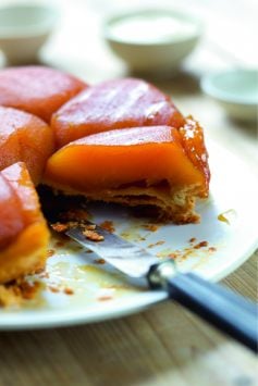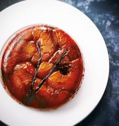 C’est dans le mode de cuisson que la tarte Tatin de Paul Bocuse puise son originalité. Les pommes sont en effet cuites dans une cocotte en fonte, dont le fond est tapissé de caramel où infusent deux gousses de vanille. La cocotte passe ensuite au four, et une seule heure de cuisson est nécessaire. Mais alors, comment obtenir l’effet renversé ? Posez votre disque de pâte sur les pommes dans la cocotte, et retournez le tout !