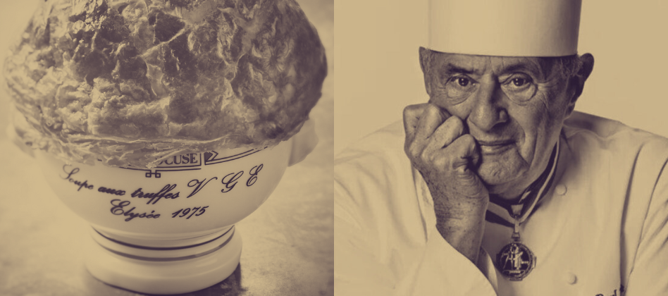 Elle a 50 ans ! Le 25 février 1975, Paul Bocuse recevait la haute distinction de l'ordre national, la Légion d'Honneur, entre les murs de l'Elysée. Pour l'occasion, le chef imagine un menu avec ses amis Michel Guérard, les frères Troisgros, Roger Vergé et Maurice Bernachon : la soupe Elysée aux truffes, qui deviendra sans tarder, la soupe VGE.