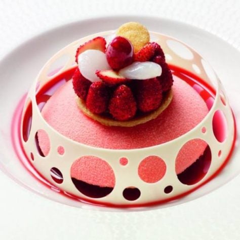 Pour rester sur un dressage raffiné, Alain Ducasse vous livre une recette au doux parfum d'exotisme. Dans un verre à Martini, le chef dresse une gelée de fraise sur laquelle repose une couche de lait au tapioca parfumé à la noix de coco et à la citronnelle. Viennent ensuite les fraises des bois qui accueillent à leur tour un sorbet fraise-coco et une meringue coco. Ce que l'intitulé ne dit pas : cette coupe glacée est servie avec une tartelette aux fraises des bois dont la pâte est un sablé à la noix de coco.
