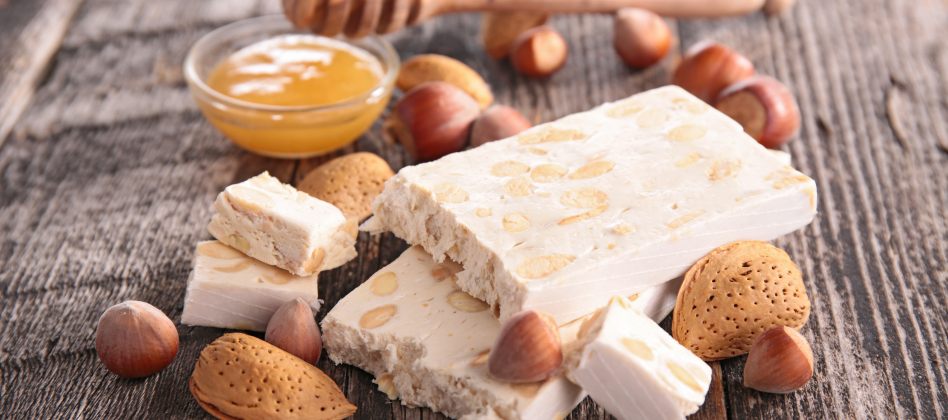 Le nougat est une confiserie séculaire originaire du Moyen-Orient et dont les premières traces remontent au Moyen-Age. Élaboré à partir de miel, de fruits secs (amandes, pistaches) et/ou de fruits confits, le nougat est généralement tapissé, sur chacune des faces, de fines feuilles de pain azyme, appelées papier azyme. Le nougat peut être tendre, et ce grâce à l'ajout de blancs d’œufs comme le nougat blanc de Montélimar agrémenté, lui, d'oranges confites, ou croquant comme le nougat noir uniquement fait de miel et d'amandes. Ces deux types de nougat font partie des Treize desserts de Noël en Provence. Il peut être aussi fabriqué qu'avec de la pistache ou modernisé avec du gianduja, une pâte à base de noisette et de chocolat.