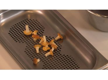 Commencer par gratter les pieds des girolles à l'aide d'un couteau. Les brosser ensuite dans de l'eau à l'aide d'un pinceau pour nettoyer le chapeau. Rincer les girolles et les égoutter.