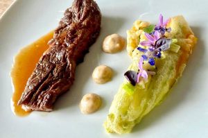 FINITION ET DRESSAGE Mélanger les cubes de courgette avec du jus de citron, du poivre et du sel Découper la viande en rectangle Faire 3 points de caviar d'aubergines Déposer 1 beignet de fleur de courgette et disposer les cubes de courgette, les fleurs et herbes dessus