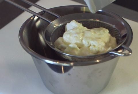 Laisser égoutter le fromage blanc à travers une passette au-dessus d'un saladier ou d'un cul-de-poule.