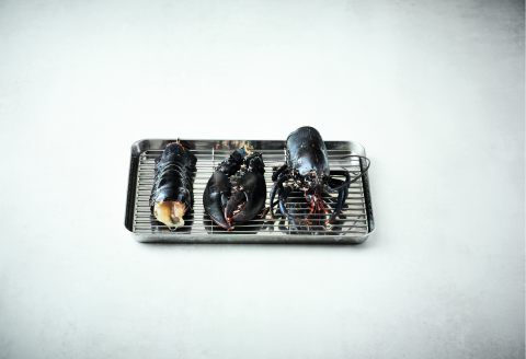 Séparez à la main les pinces et les coudes de la tête, puis la tête du corps des homards. Incorporez le long du dos des homards une aiguille à brider pour s’assurer qu’ils restent droits pendant leur cuisson.