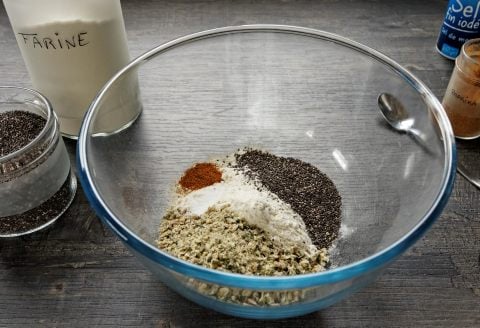 Dans un saladier, mélanger la farine avec les graines mixées, les graines de chia, le sel et le paprika.