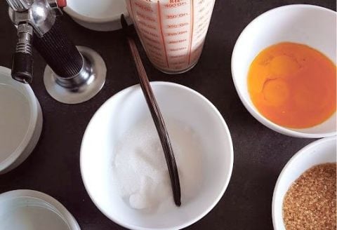 Coupez la gousse de vanille en deux pour extraire les graines Faites chauffer la crème à feu doux avec les gousses et laissez infuser Battez énergiquement les jaunes et le sucre + les graines de vanille pour obtenir un mélange mousseux dans la cuve du Cooking chef gourmet accompagné du fouet ballon Versez progressivement la crème tiédie et filtrée sur le mélange jaune/sucre en mélangeant en continu Faites préchauffer le four a 160°C