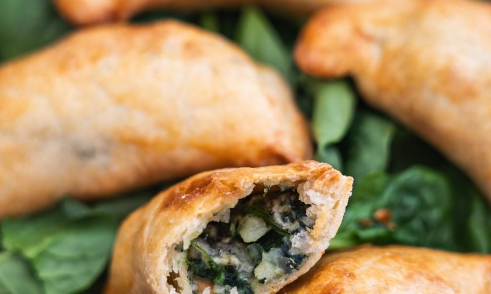 Les empanadas sont, à l'origine, des spécialités de la cuisine espagnole ou d'Amérique du Sud traditionnellement farcies à la viande, poisson ou pommes de terre. Ici, la cheffe Chloé Charles le cuisine avec épinards, bleu d'Auvergne et noisettes pour une farce craquante qui ne manque pas de caractère.