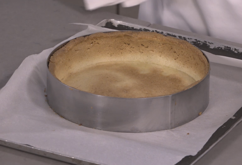 Réaliser une pâte brisée. Foncer un cercle à pâtisserie avec la pâte brisée. Disposer un sac allant au four rempli de farine au fond du moule pour maintenir la pâte. La précuire à 180°C pendant 10 à 12 minutes.