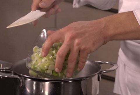 Retirer la racine des poireaux et couper le vert (le réserver éventuellement pour un potage). Fendre les blancs dans leur longueur de 2 coups de couteau. Puis les plonger dans un grand récipient rempli d’eau tempérée et bien les agiter pour éliminer toute trace de terre. Les égoutter, les sécher et les émincer. Éplucher et ciseler l’oignon.