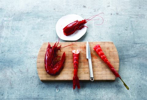 Décortiquez les gambas : ôtez la tête et laissez le dernier anneau de la queue. Ôtez le boyau noir situé sur le dos. Maintenez la gambas droite à l’aide d’un pic en bois. Mettez de côté au frais.