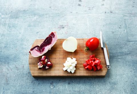 Coupez le jambon en morceaux, lavez les tomates et coupez-les en morceaux. Pelez et épluchez les oignons et coupez-les en morceaux. Faites suer tous ces éléments avec un peu d’huile d’olive dans une casserole.