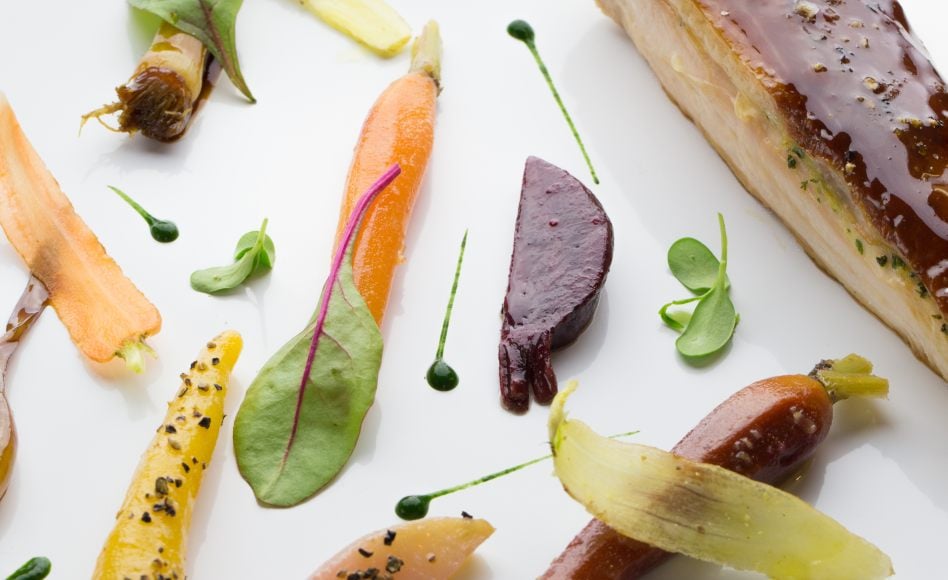 La poularde cour d'Armoise, issue d'une race ancienne à croissance lente, est élevée au minimum 5 mois. Ici, elle est farcie aux herbes, accompagnée de légumes confits cuits et crus ainsi que d'une crème de persil.