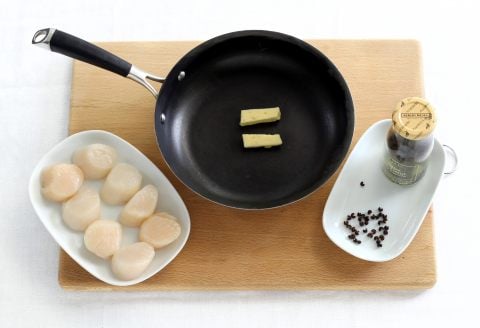 Chauffer le beurre dans une poêle, ajouter quelques baies de Timut. Ajouter les Saint-Jacques et les faire dorer une minute par face. Saler, poivrer et réserver au chaud.