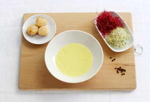 Répartir la sauce dans les assiettes, y dresser les Saint-Jacques dessus. Assaisonnez avec des baies de Timut moulues et ajouter les graines germées. Servir aussitôt.