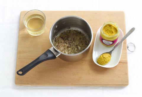 Ajouter la pâte de curry, remuer, arroser de vin blanc.