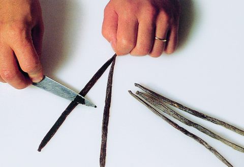 Fendez la gousse de vanille en deux dans le sens de la longueur, raclez avec un couteau les graines qui sont à l'intérieur.