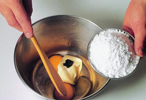 Réunissez dans un saladier le beurre, l'œuf, le jaune d'œuf, les graines de vanille et le sucre glace. Travaillez le mélange à la spatule.