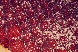 Garnir le fond de tarte refroidie (l’épaisseur est faible c’est normal). Mettre de la dorure sur les bords de la pâte . Cuire 10 min à 160°C.