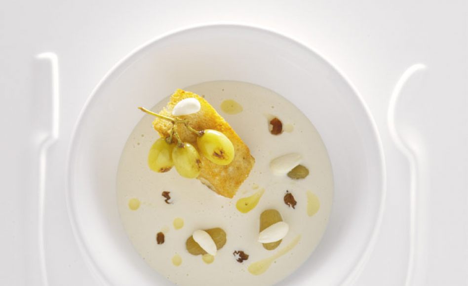 Le White smoothie n'est autre qu'un ajo blanco, fameuse soupe froide espagnole à base d'amandes, quelque peu revisitée dans cette recette fraîche et élégante. La mie de pain n'est pas mixée avec les amandes marinées dans le lait mais se retrouve, pour un contraste de texture, toastée et frottée à l'ail pour accompagner ce gaspacho blanc agrémenté de grains de raisins.