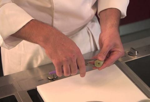 Décortiquer les amandes fraîches en veillant à ne pas abîmer les graines. Les dérober,. En réserver 10 entières pour le dressage. Couper le reste en deux et les mettre dans un saladier. Recouvrir de lait et laisser tremper 30 minutes.