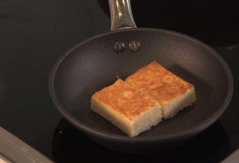 Ôter la croûte puis couper le pain en quatre tranches de 2 cm d’épaisseur. Les retailler en rectangles de 6 x 3 cm. Éplucher la gousse d’ail puis la frotter sur les deux faces des rectangles de pain. Les badigeonner d’huile d’olive à l'aide d'un pinceau. Les faire dorer dans une poêle anti-adhésive sur chaque côté. Les réserver sur un papier absorbant.