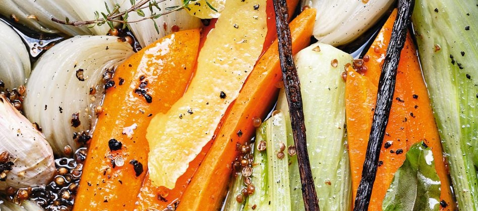 Pas commune cette association de légumes et de vanille... Et pourtant quelle belle trouvaille ! Le chef Alain Ducasse imagine un accompagnement idéal au début des beaux jours : un bouillon de cuisson de légumes printaniers parfumé à la vanille et à un mélange d'épices comme les graines de coriandre et grains de poivre mais aussi de thym et de laurier.