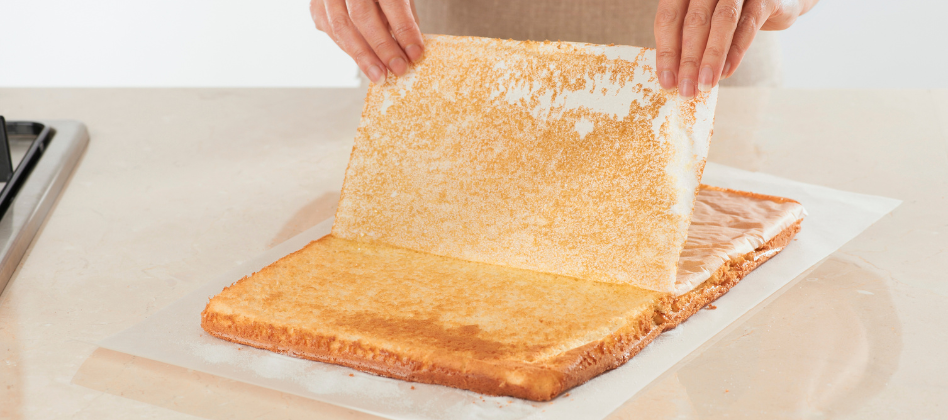 Après avoir enfourné et cuit votre biscuit, sortez-le et démoulez-le sur un torchon humide, la partie en contact avec le papier sulfurisé vers l'extérieur. Vous pouvez saupoudrer le torchon de sucre glace pour éviter que la pâte ne colle au tissu.