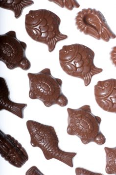Dans la Bible (Nouveau Testament Jean 21.1-25), on peut lire que le Christ, après sa résurrection, s’est montré à ses Disciples au bord du lac de Tibériade. Ceux-ci venaient de passer une nuit à la pêche sans rien prendre. Il leur dit de jeter le filet à droite de la barque et ils le remontèrent archi plein. C’est ainsi, en référence à cette pêche miraculeuse, que les poissons en chocolat existent en formats plus ou moins grands. Et parce que les petits se cuisent volontiers dans un bain d’huile bouillante, on a vite imaginé de rassembler ceux en chocolat dans un sachet, avec souvent des coquillages, et de les baptiser « friture » !