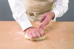 Commencez par mélanger la pâte avec les doigts en ramenant la farine vers le centre de la fontaine, tout en versant un peu d'eau tiède. N'oubliez pas de fariner le plan de travail avant de pétrir votre pâte et de la travailler à la main en incorporant un maximum d'air. Laissez reposer sous film au moins 1 heure à 23°C.
