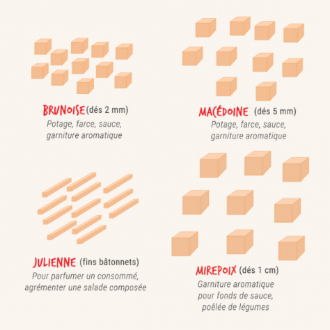 Un peu plus grosse que la brunoise, la macédoine se présente sous forme de petits dés réguliers d’environ 5 mm. Utilisation : on la retrouve souvent dans les salades composées, les garnitures de viandes ou de poissons et certaines farces.