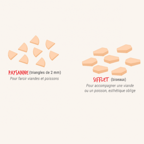 Avant de manier le couteau comme un chef, il faut connaître les bases. Les taillages classiques se distinguent selon la taille et la forme des morceaux. Ils servent aussi bien à rehausser les saveurs d’un plat qu’à le sublimer visuellement.
