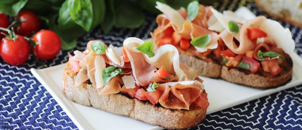 Si la France et l’Espagne peuvent se targuer d’avoir d’extraordinaires produits charcutiers, l’Italie n’a pas à rougir des siens, eux aussi exceptionnels. Prenons le jambon cru San Daniele, produit exclusivement dans le Frioul-Vénétie julienne, une région autonome et frontalière de la Slovénie. Ce jambon cru issu des meilleurs porcs de la région est séché durant 12 à 24 mois à San Daniele avant d’être marqué d’un sceau aux initiales de la commune. Le jambon cru San Daniele est AOP depuis 1966, un gage de qualité. On le déguste à l’apéritif avec un verre de chianti, un vin rouge italien également AOP, ou en entrée pour agrémenter une salade composée, des involtini à la viande ou des tartines. A l’instar des bruschettas, ce pain grillé et frotté à l’ail garni de tomates, de parmesan et de ce jambon cru au goût fruité. Une recette simple et rapide à réaliser qui fleure bon l’été.