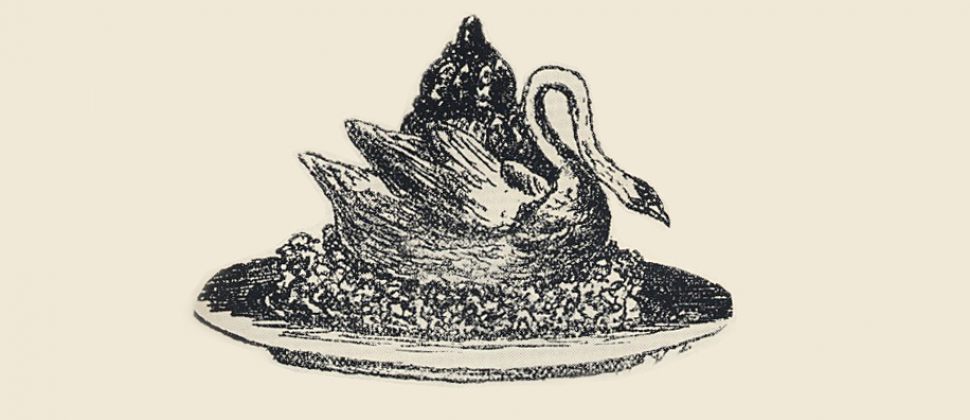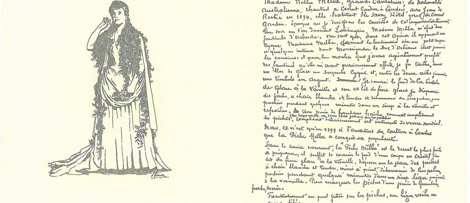 Madame Nellie Melba, grande cantatrice de nationalité australienne, chantait à Covent Garden à Londres avec Jean de Reszke en 1894. Elle habitait le Savoy Hôtel près de Covent Garden, époque où je dirigeais les cuisines de cet important établissement. Un soir où l'on donnait Lohengrin, Madame Melba m'offrit deux fauteuils d'orchestre. On sait que, dans cet Opéra, il apparaît un cygne. Madame Melba, donnait le lendemain soir un petit souper à quelques intimes dont Monseigneur le Duc d'Orléans était parmi les convives. Et pour lui montrer que j'avais agréablement profité des fauteuils qu'elle m'a gracieusement offerts, je fis tailler dans un bloc de glace un superbe cygne et, entre les deux ailes [je mis] une timbale en argent. Je couvris le fond de la timbale de glace à la vanille et sur ce lit de fine glace, je disposai des pêches à chair blanche et tendre […] pochées pendant quelques minutes dans un sirop à la vanille et refroidies. Une purée de framboises fraîches couvrait complètement les pêches. Un léger voile en sucre filé [recouvrait] les pêches. […]