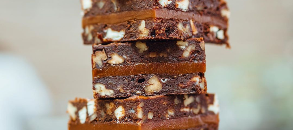 Faites le caramel et versez-le sur le brownie, placez immédiatement le deuxième morceau de brownie. Réfrigérez et découpez des carrés de 6 x 6 cm. Coupez ces carrés en deux en diagonale afin d'obtenir un mini-club sandwich.