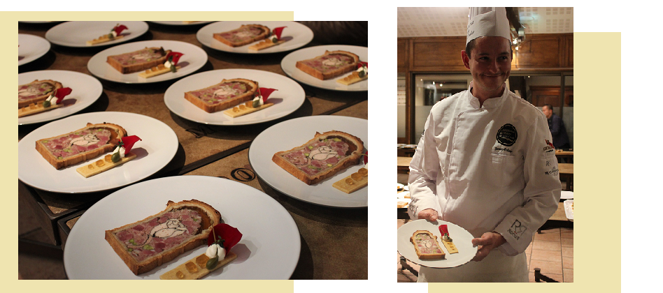 Dix minutes avant l’envoi en salle pour dégustation, la mise en place d’Olivier Horville (Maison Vérot) était déjà fin prête. Au cœur de la tranche, une rose composée de boudin de volaille. Des trompettes de la mort pour dessiner les contours des pétales, la tige en mousse de foie de canard et la farce à base de canard et de porc, gésiers de canard à l’ail. Baptisé "élégance" son petit chef d'oeuvre lui permettra de remporter le prix… d’élégance, et de gravir la troisième marche du podium. L’an dernier, le candidat alors malheureux, avait été disqualifié pour un couac de dernière minute : la gelée ne s’était pas correctement répandue à l’intérieur de son pâté en croûte.