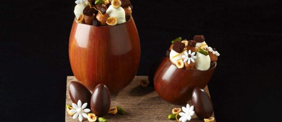 Cyril Lignac frappe fort avec cet œuf aux effets boisés qui renferme de multitudes de petites gourmandises chocolatées et fruitées.