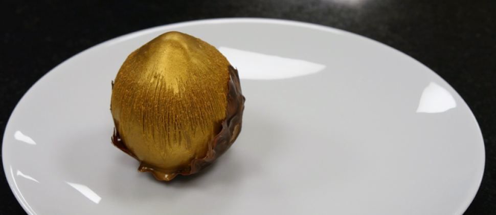 Ce dessert en trompe-l’œil est hommage bien appuyé à ce petit fruit à coque : sous la coquille de chocolat au lait se cache un biscuit dacquoise à la noisette sur lequel repose une boule noisette au cœur praliné et caramel. Le tout enrobé d'une mousse ... à la noisette !