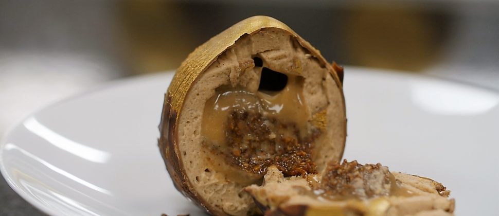 Comment Cédric Grolet parvient-il à reproduire cet aspect ? Après l'étape de l'enrobage (beurre de cacao + chocolat au lait), le chef brosse la surface de la coque pour former ces stries. De la poudre d'or et une feuille de chocolat plus tard et l'on obtient ce dessert que le chef met à la carte du tea time. Mais de manière exclusive pour que la majesté de ce dessert ne s'évanouisse pas au fil des saisons.