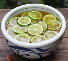 « Il est utilisé vert au Japon, il y en a dans tous les bento avec du poisson ou des crustacés. La spécificité, c’est de le présenter mûr, il est alors orange. C’est un citron mais qui a de la complexité aromatique. Au goût, c’est assez bizarre, pas vraiment mandarine, comme laisse présager la couleur orange. L’acide est un acide de citron, vif mais pas agressif. Très mûr, on peut le faire en marmelade style confiture de citron. »