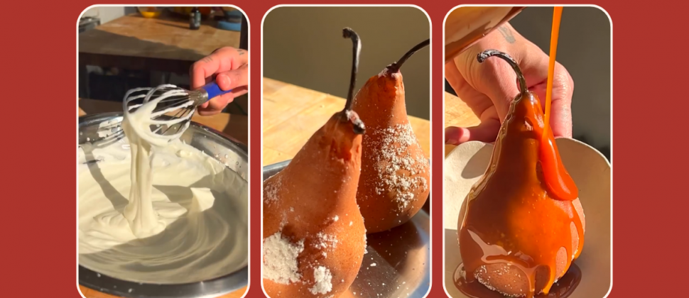 Sophia Roe s’est imposée comme une référence moderne de la cuisine végétale et intuitive. Sa signature : révéler la beauté brute des ingrédients, les fruits en particulier, à travers des techniques surprenantes et des associations inattendues. Sa recette de poires cuites en croûte de sel illustre parfaitement sa démarche. En détournant une méthode plutôt réservée aux viandes ou poissons, elle transforme un fruit d’hiver en un dessert fondant, presque confit, souligné par un caramel de coco onctueux.