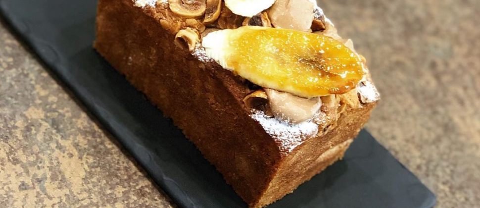 Ingrédients : 110 g de beurre - 150 g de sucre cassonade - 80 g d'oeuf - 200 g de banane - 170 g de farine - 7 g de levure chimique - 10 g de rhum brun - 1,5 g de sel - noisettes torréfiées - banane cru pour la décoration - gianduja