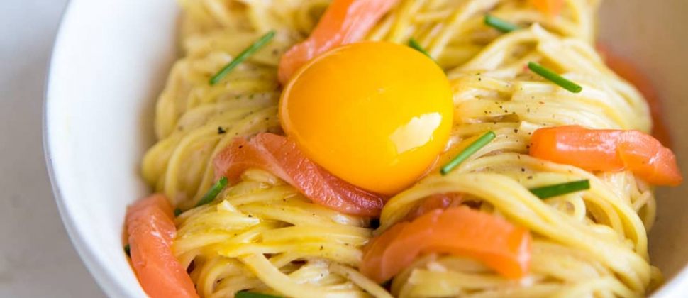 Nouilles chinoises et carbonara au cœur de saumon Petrossian avec la cheffe Adeline Grattard.