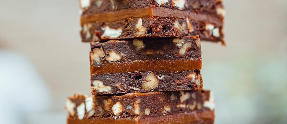 Faites le caramel et versez-le sur le brownie, placez immédiatement le deuxième morceau de brownie. Réfrigérez et découpez des carrés de 6 x 6 cm. Coupez ces carrés en deux en diagonale afin d'obtenir un mini-club sandwich.