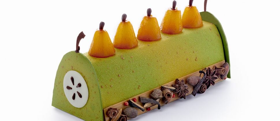 La bûche de Noël du Park Hyatt Paris Vendôme, par Jimmy Mornet. Une bûche créée autour du sudashi, petit agrume vert et sauvage japonais, que le chef associe à la douceur de la poire, pour un dessert aussi audacieux qu’original.