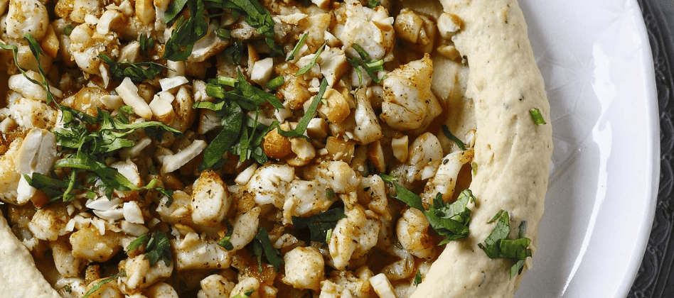 Une nouvelle façon de déguster du houmous, cette fois-ci on y ajoute du mérou, ce poisson à la chair gourmande et à la saveur délicate. On parsème le tout de noix de cajou pour obtenir une touche croquante. Le tahini, utilisé dans la réalisation du houmous, est excellent pour la santé : vitamines B, minéraux, acides gras et oligo-éléments... alors que les pois chiches (nos légumineuses préférées) apportent protéines végétales, fibres et permettent de réduire le mauvais cholestérol.
