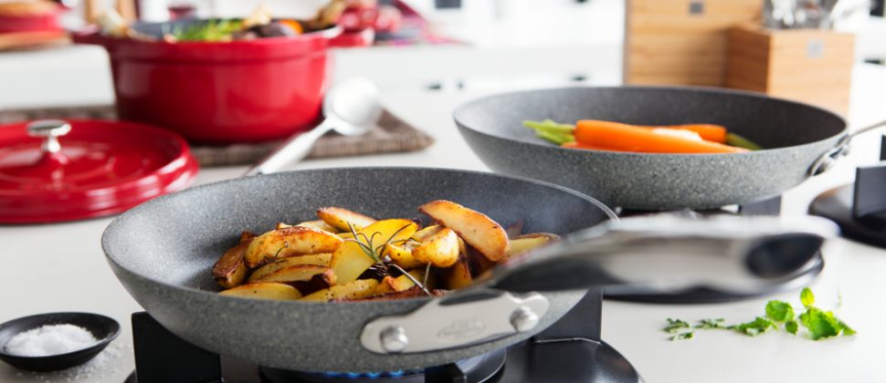 Afin de promouvoir l’alimentation saine si chère à son coeur, Ballarini a développé la technologie Portofino Granitium. Poêles, woks, grils, faitouts, sauteuses… Tous ces ustensiles sont en aluminium épais, revêtus de 5 couches renforcées en particules minérales non poreuses. D’où leurs propriétés antiadhésives ! Plus besoin, donc, d’ajouter d’huile ou de beurre : rien ne reste accroché au fond. À vous poêlées de légumes en tous genres et ratatouilles, pad thaï au magret de canard, pavés de saumon ou de rumsteck, tournedos rossini bien dorés, juteuses boulettes de boeuf à la sauce tomate à servir avec de bonnes pâtes ou encore, tendre poulet accompagné de ses moelleuses pommes de terre !