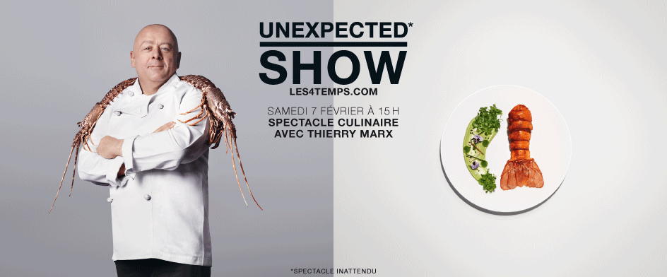 Thierry Marx, chef 2 étoiles au Mandarin Oriental, proposera le samedi 7 février 2015 un spectacle culinaire d'exception au centre commercial 4 Temps situé à la Défense. Une expérience inédite, gratuite et en live pour découvrir ses dernières créations.