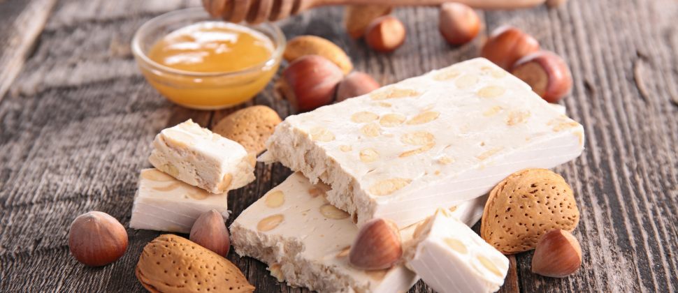 Le nougat est une confiserie séculaire originaire du Moyen-Orient et dont les premières traces remontent au Moyen-Age. Élaboré à partir de miel, de fruits secs (amandes, pistaches) et/ou de fruits confits, le nougat est généralement tapissé, sur chacune des faces, de fines feuilles de pain azyme, appelées papier azyme. Le nougat peut être tendre, et ce grâce à l'ajout de blancs d’œufs comme le nougat blanc de Montélimar agrémenté, lui, d'oranges confites, ou croquant comme le nougat noir uniquement fait de miel et d'amandes. Ces deux types de nougat font partie des Treize desserts de Noël en Provence. Il peut être aussi fabriqué qu'avec de la pistache ou modernisé avec du gianduja, une pâte à base de noisette et de chocolat.